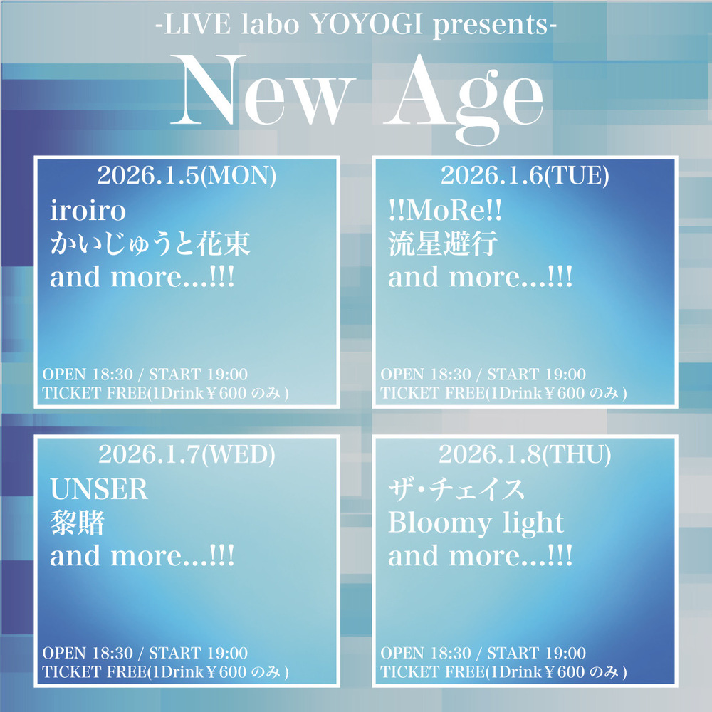 -LIVE labo YOYOGI presents- New Age SCHEDULE 2026/01/05(月) 19:00 - 代々木ラボ 2026.1.5(MON) iroiro かいじゅうと花束 and more...!!! OPEN 18:30 / START 19:00 TICKET FREE(IDrink¥600のみ) URLをコピーする 報告する
